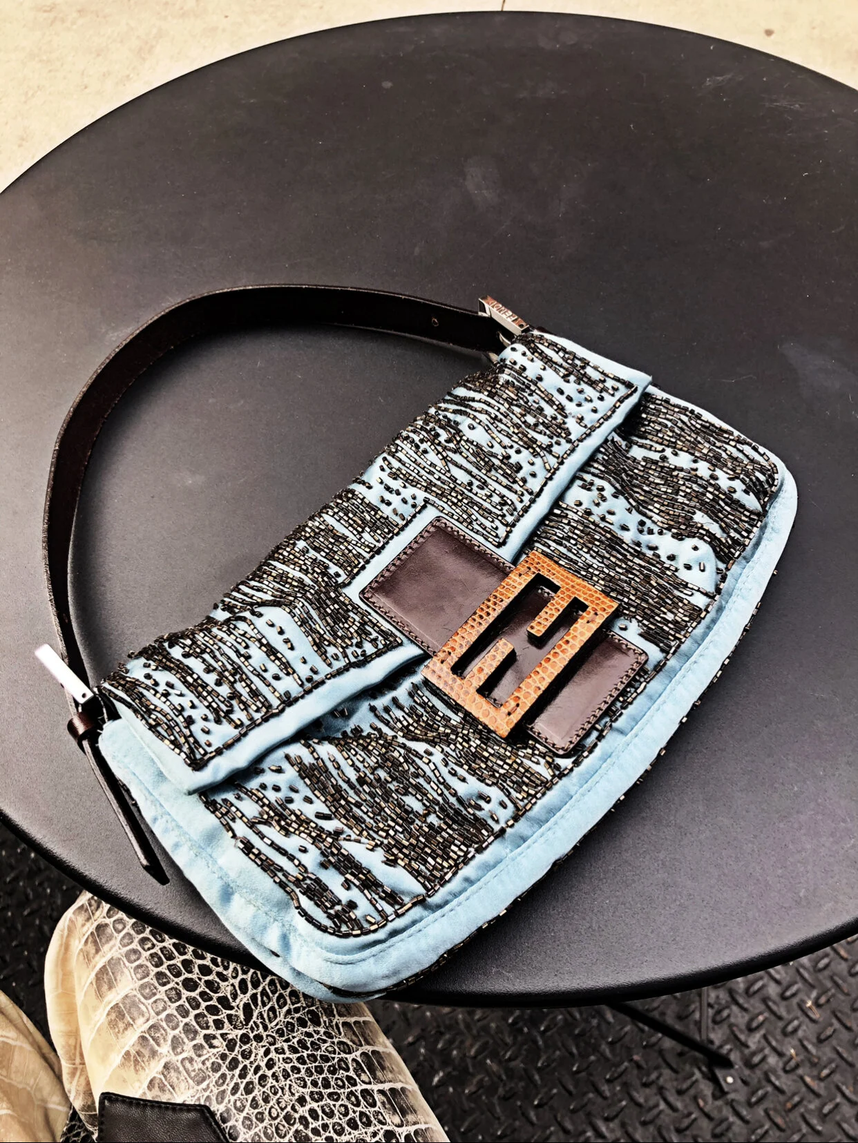 When searching for the perfect Fendi Baguette there was a lot to consider because we know these beauties are not cheap. There is a lot to consider when purchasing a luxury vintage bag you have to consider is it still usable because of its age. Will it complement the rest of your wardrobe and is it worth the pretty penny. I was looking online for about 3 months for a Fendi Baguette because I wanted something different from my Christian Dior saddle bag which I think has ran its course in the trendy fashion scene. But I could not find one worth the money or that fit with my personal style the ones available just didn’t speak to me. But just as I was about to throw in the towel I was window-shopping at what goes around comes around. And I was just looking at the new pieces and I come across this beauty. It instantly caught my eye because of its beautiful blue satin canvas and delicate brown beading. And the python label makes it that much more funky and unique. It demands attention. It was the baguette of my dreams and I knew it would be an amazing investment and that I would have it forever. If you are in the market for one of these beauties don’t just buy the first one you see just to be part of the club. Shop around for that special one that speaks to you. Overall it’s a great functioning bag easy to carry plenty of room in the bag with a timeless silhouette. It looks great on your shoulder or carried in your hand. It’s the perfect bag for a night on the town but it if you are purchasing a baguette with sequins or beads they should be treated with care because the canvas is so fragile. Join the Carrie Bradshaw “ it’s not a bag is a baguette” club and live you best sex and the city fantasies.